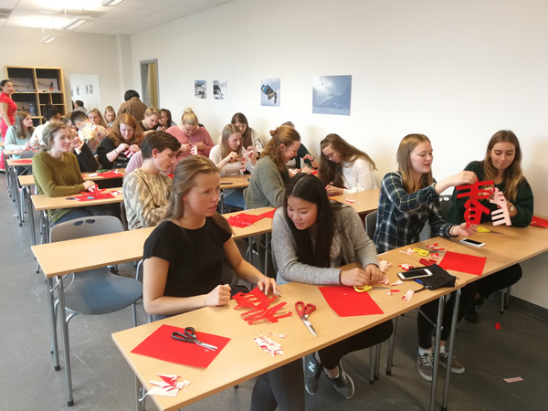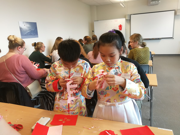 “我们一起来剪中国的‘春’字吧!”看到现场观看的挪威大哥哥大姐姐们跃跃欲试,宋金珠、梅乐即兴与当地学生进行剪纸交流,现场传授挪威大哥哥大姐姐学剪中国“春”字。大家一听很高兴,跟着他俩一招一式的剪了起来,一个个“春”字在大家的手上诞生了,人人心里都是乐开了花。