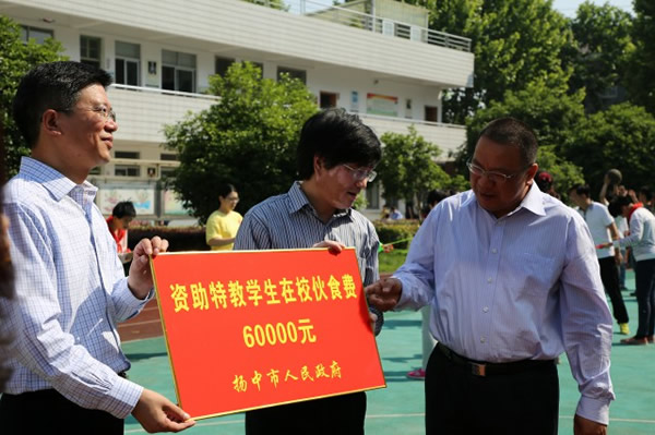 5月17日上午,在第27个全国助残日来临之际,扬中市委副书记马家胜,市政府副市长宫金生来到扬中市特教中心走访慰问,并送上慰问金。扬中市政府教育督导室主任、教育局副局长戴凤云,教育局纪委书记司晓玲以及扬中市残联相关领导陪同慰问。