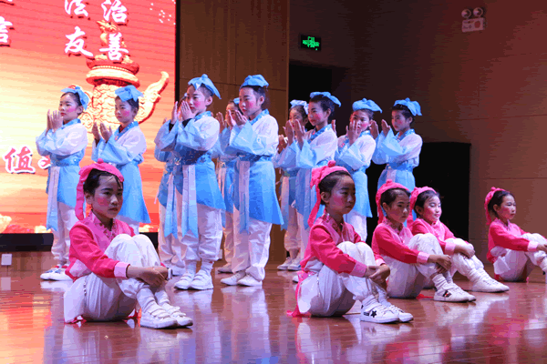 校园大厅内古韵悠扬,书声琅琅,稚声古韵中传递着经典的力量。《三字经》、《弟子规》、唐诗、宋词……仿佛透过千年尘埃,穿越时空隧道,缓缓打开中华民族五千年文明长卷,将现场观众的思绪牵引到那个“满腹诗书”的历史岁月。