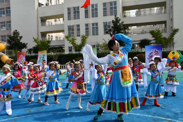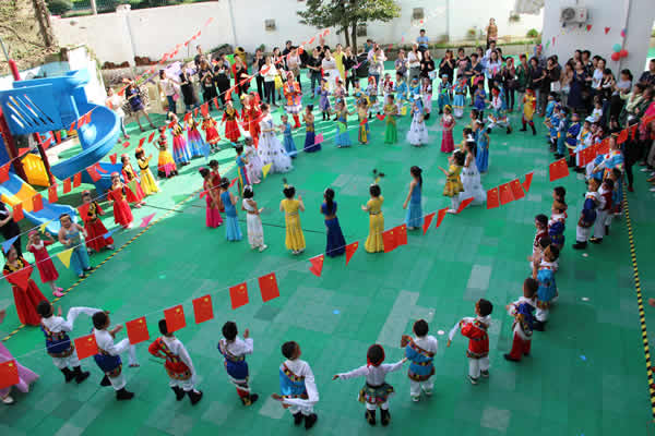 活动从庄严地升旗仪式中开始,鲜艳的五星红旗伴随着雄壮的国歌声冉冉上升。各班级中代表不同民族的小朋友一一亮相,在老师的带领下翩翩起舞,演绎民族风情,赢得家长们的阵阵掌声。孩子们用稚嫩的童音和纯真的心灵表达自己对祖国妈妈最真切的情感。随后“民族美食一条街”将活动带入高潮,家长们与孩子为全园准备了丰富的民族特色美食,大家在欢声笑语中品尝欣赏,在悠扬的琴声中暂别此次大联欢活动。